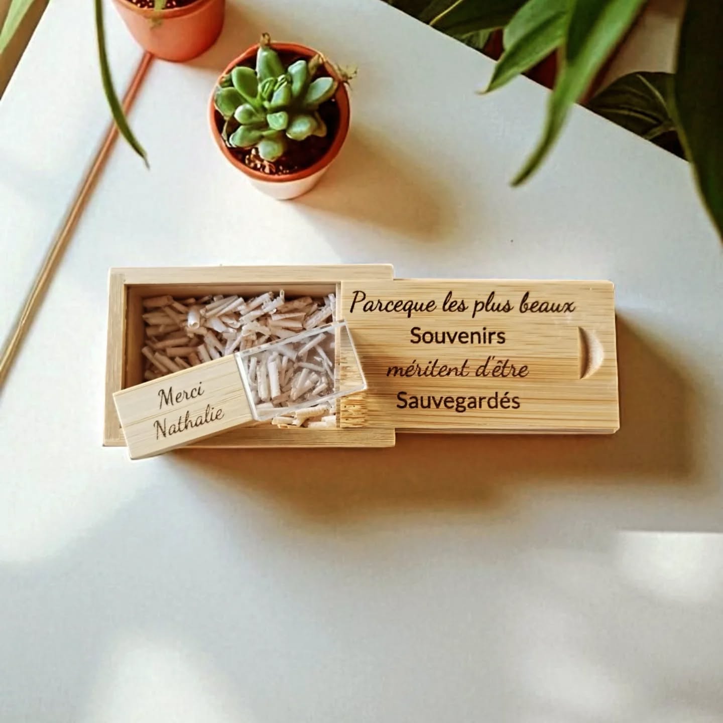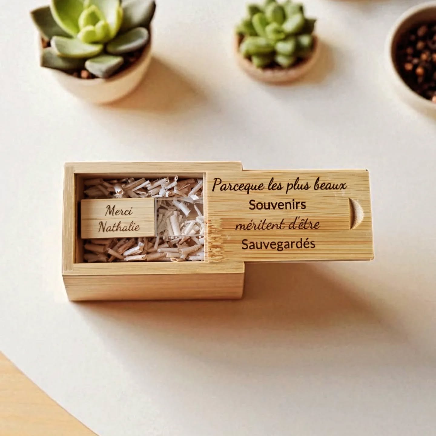 Les clés USB en bois sont personnalisées avec une gravure délicate et chaleureuse : une petite attention qui fera toute la différence.